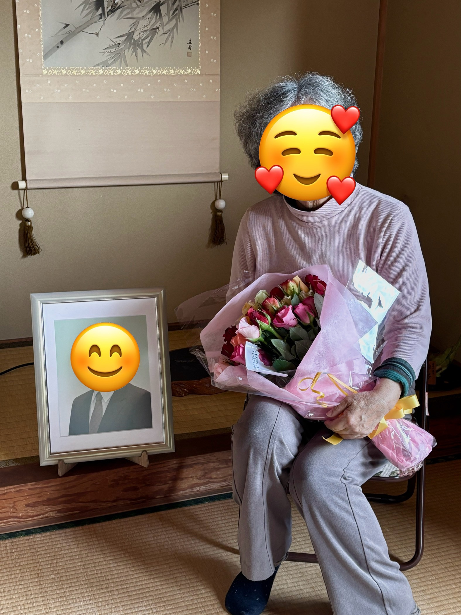 今年も美しいバラをありがとうございます。毎年、母の日のプレゼントのバラの花束を、母は大変大変喜んでいます。数年前に亡くなった父と今年も記念撮影させていただきました。