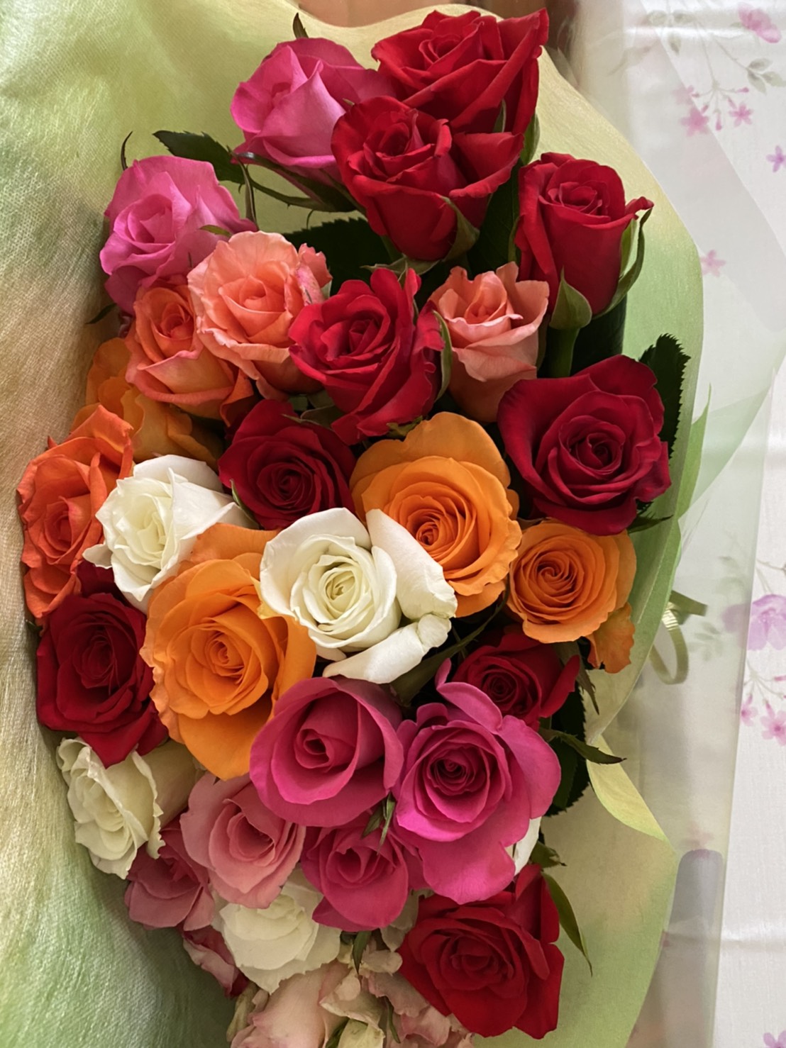 両親の結婚55周年と私達の結婚30周年のお祝いにミックスバラの花束をお願いしました。55本のずっしりとした豪華な花束に両親は大感激!私も30本の色とりどりのバラを一日に何度も眺めてはうっとりと幸せな気持ちになっています。初めての利用で何度も質問やお願いメールを送りましたが、お忙しい中、すぐにご丁寧な返信をくださり、どうもありがとうございました。